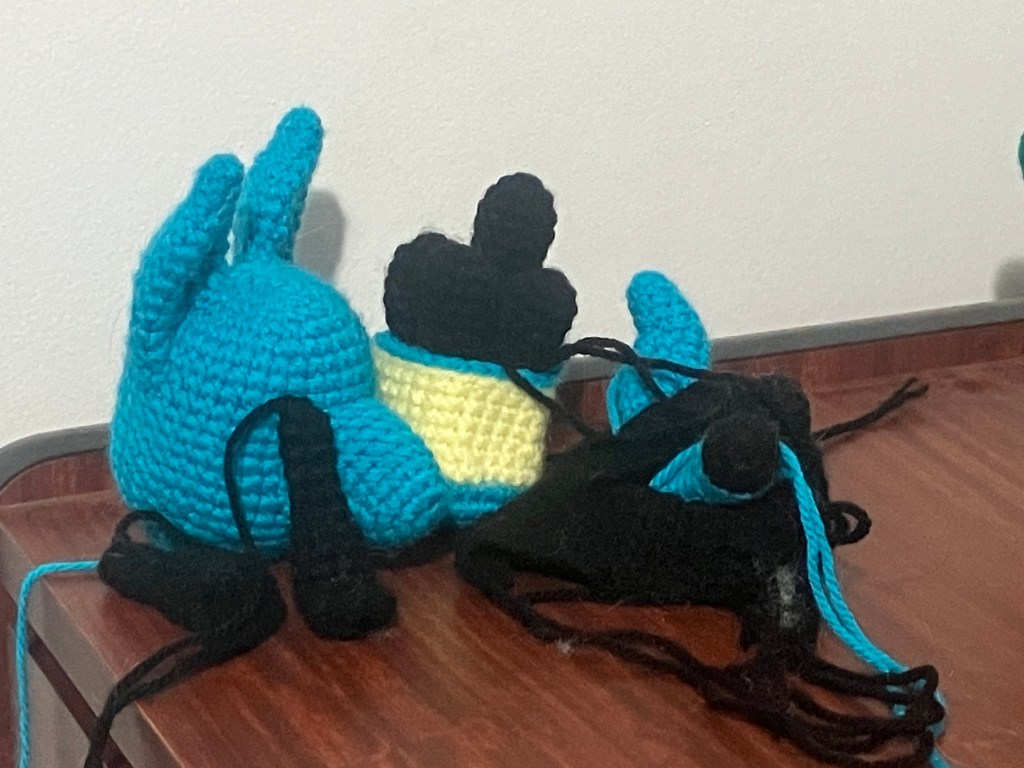 I usually place the legs on first. Making sure my toes are pointing up I attach my legs so they cover row 5-6 on the body separated by 7-8sc depending on where they’re being placed. As a reference please ensure you leave at least one blue row of sc on the body visible.